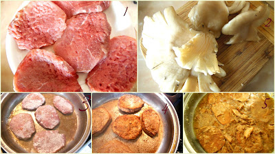 Изважда се и в същата мазнина се задушава много ситно нарязаният лук добавят се 2-3 нарязани на ивички гъби, 100 мл вино и 100 мл вода, розмарин, сол. Месото се връща в тигана, покрива се с капак и се задушава на най-слабата степен на котлона за около 30-40 минути, до омекване сн.5 В отделен тиган в смес от масло и зехтин се пържат останалите гъби.