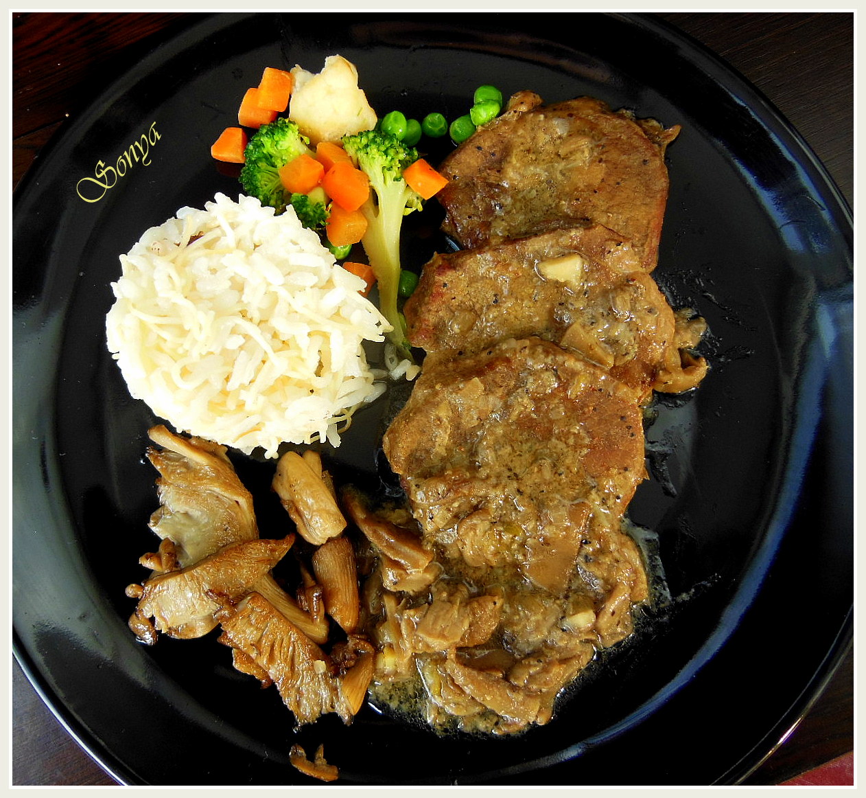 Предложеното ястие е много леко, независимо, че е с „червено „месо.Месото е от вайсбрат (мускулите от външната част на бута). Гъбите са пресни, кладница. Участват в соса, като му придават гъбен вкус и аромат и като гарнитура, карамелизирани в смес от масло и зехтин. Ястието се допълва от задушени зеленчуци и задушен ориз с фиде