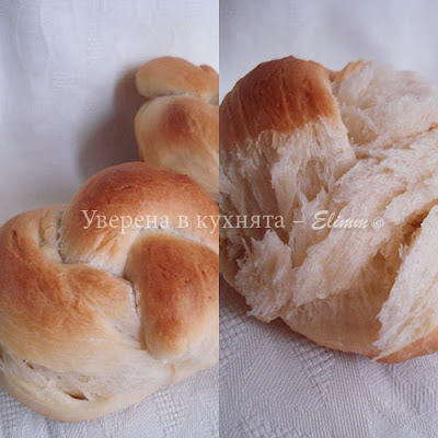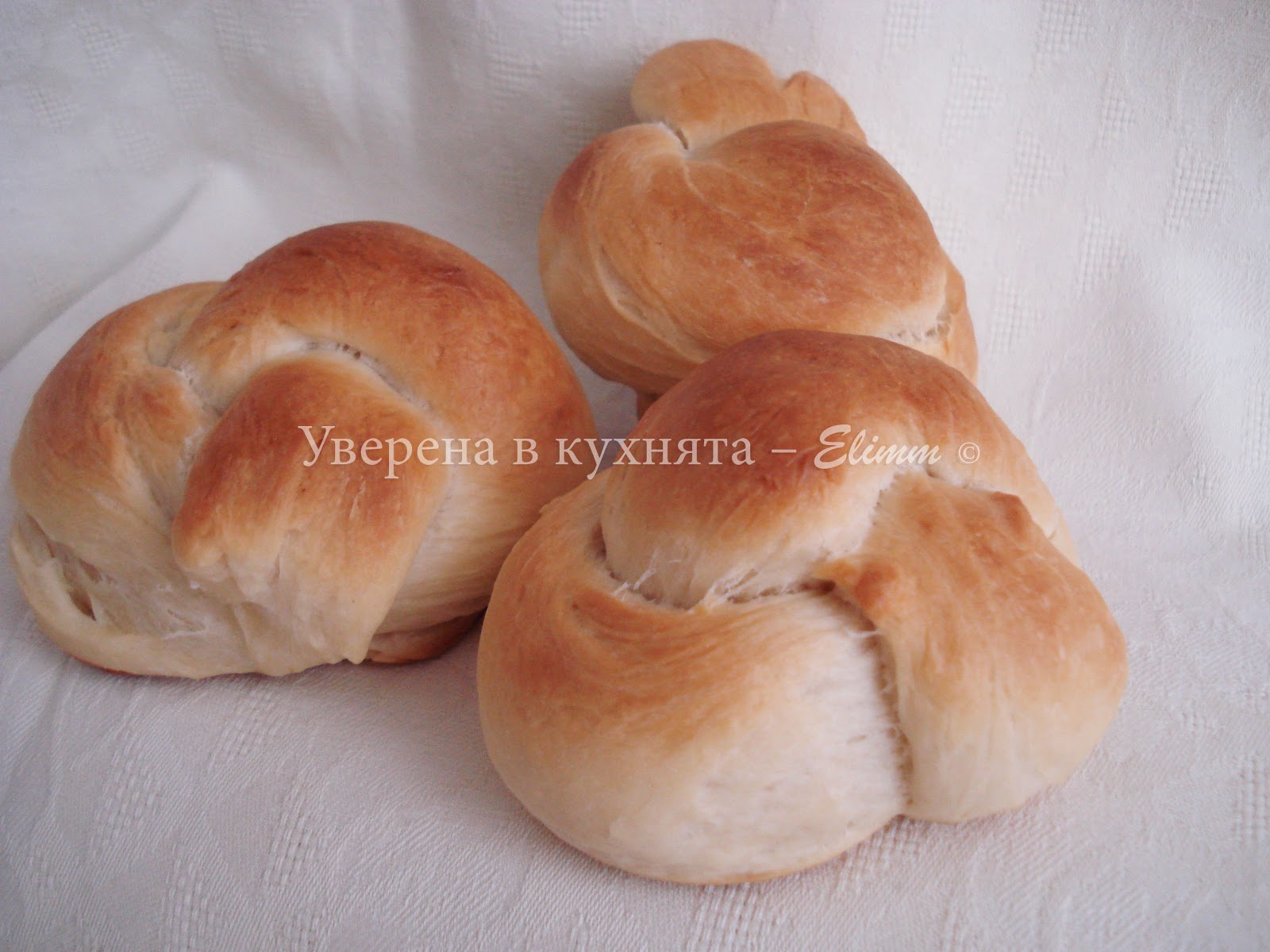 Готовото тесто разделих на равни части и оформих фитилчета, които завързах на възелчета и подпъхнах краищата навътре за да се образува нещо като цвете. Подредих в тава застлана с пекарска хартия и оставих на топло за 30 мин да втасат повторно. Преди да ги изпека ги намазах само с прясно мляко. Пекох на 200 гр. до готовност.
