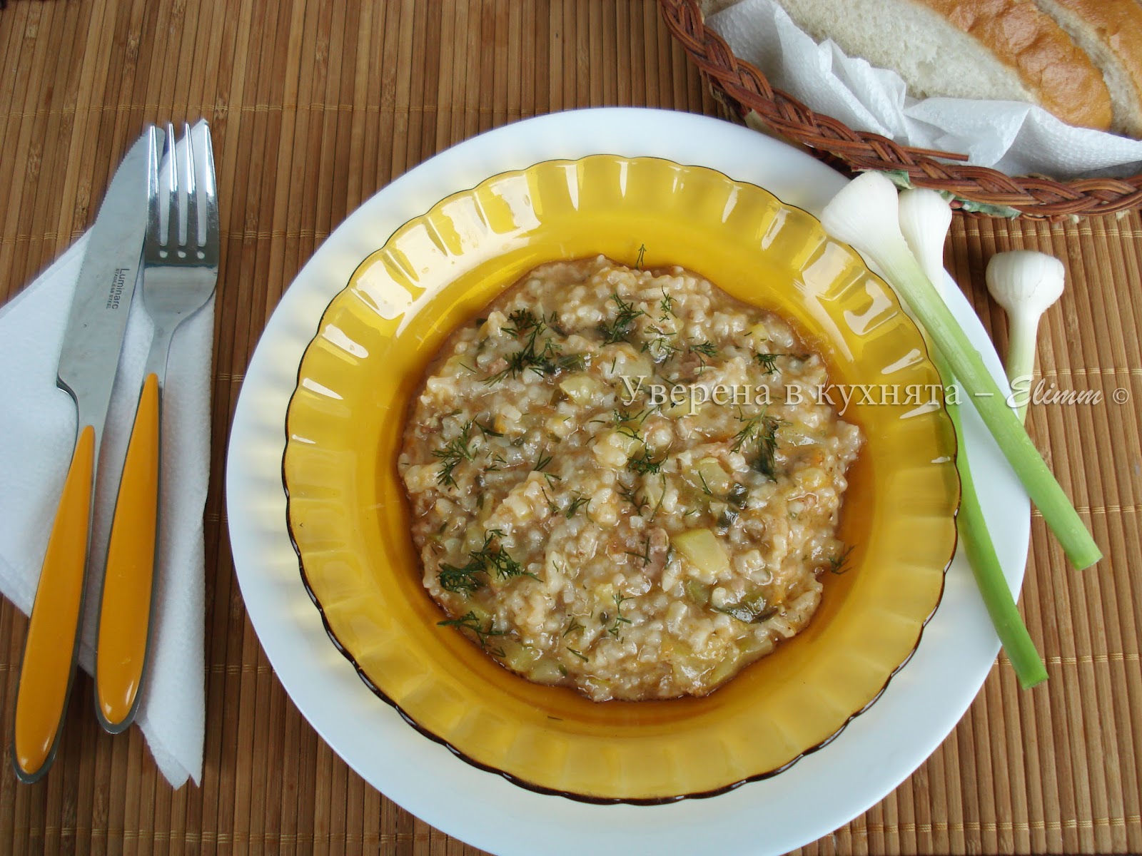 В подходящ съд запържете лука, чесъна, настъргания морков, ориза и каймата. Нека да омекнат зеленчуците. Тиквичката нарежете на малки кубчета и добавете към ориза. Налейте около 200 мл. вода и оставете да поври на среден огън. След като ориза е набъбнал добавете сол на вкус и останалите подправки, аз само магданоза добавям накрая за да запази миризмата си. Ако е необходимо добавете още малко вода, за да се сготвят нацяло тиквичките. Ястието е готово тогава когато са омекнали зеленчуците и водата се е изпарила на цяло. Страхотно е за консумация както топло, така и студено, но при всички случаи със студена бира и много чесън.
