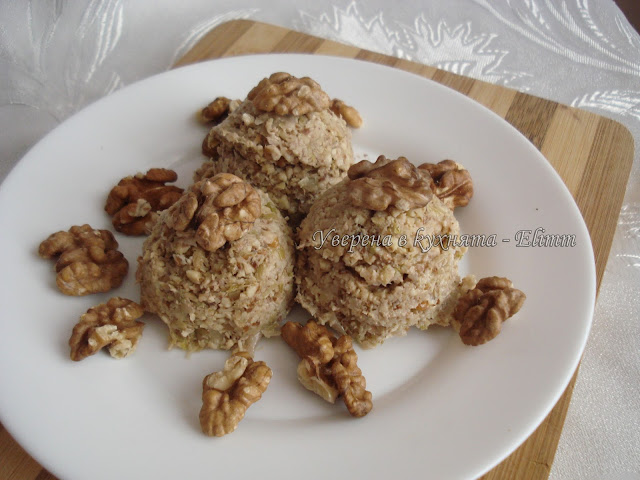 Празът и лукът се почистват и се накълцват. Задушават се в маслото, докато омекнат, без да се карамелизират. След това в блендер се смилат на пюре, заедно със запечените на сух тиган орехи, зехтина, лимоновия сок, чесъна, сол и черен пипер на вкус. Използвайте за салата или гарнитура към печено месо.