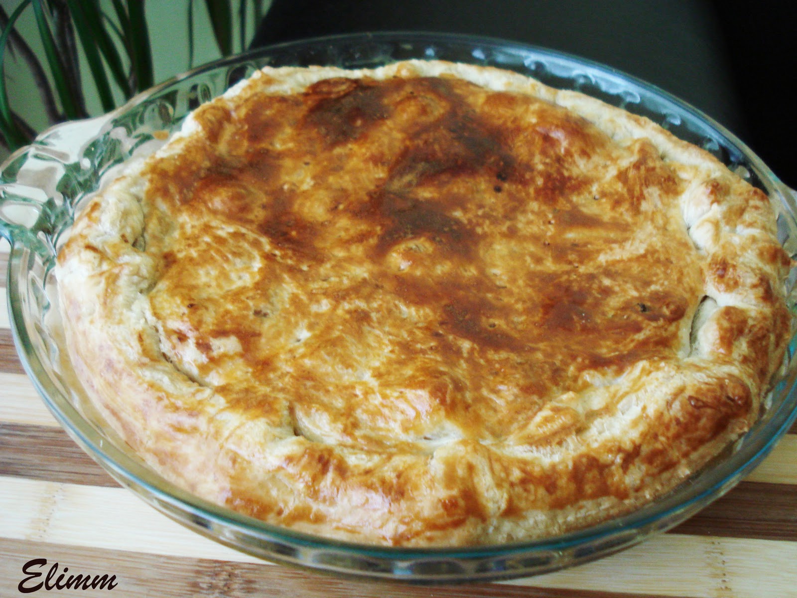 Разделете бутер тестото на две като едната кора съвсем леко я разточете, с диаметъра на тавата в която ще печете. Нека тестото покрие изцяло дъното и страните на тавата, че и малко да излиза извън нея. Намажете обилно с разбития белтък. Разпределете цялата плънка, и покрийте с другата част от тестото. А онази част от долната кора, която излиза извън тавата я прегънете по посока към центъра. Трябва да се образува борд. Намажете целия щрудел с разбития жълтък и с вилица направете няколко пробождания за да може да излиза парата докато се пече. Изпечете в предварително загрята фурна на 200 гр. да готовност. По желание може докато е още топъл да поръсите с пудра захар.